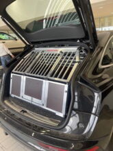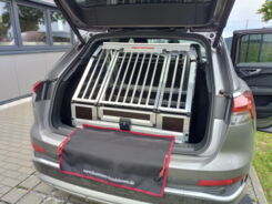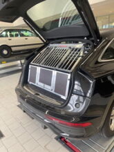 Eine Maßanfertigung für einen Audi Q7. Die Hundebox ist mit Fallenschlössern ausgestattet. Als Modell wurde die A2-Doppelbox verwendet.