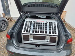 Diese A1- Einzelbox ist eine Maßanfertigung für einen Audi A6 Avant 2016. Die Hundebox nimmt etwa die hälfte des Kofferraumes ein. Noch sicherer haben wir diese Hundebox mit einem Notausstieg, auf der Rückseite der Transportbox gemacht. Ein Stoßstangenschutz schützt die Stoßstange des Fahrzeuges vor Kratzern.