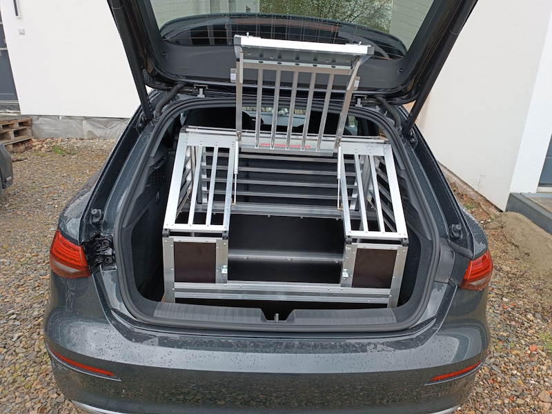 Hier wurde wieder alles aus dem Kofferraum des Audi A4 Avant gemacht. Mit unserer Bauch-Einzelbox findet auch ein großer Hund seinen Platz in dieser Hundebox.