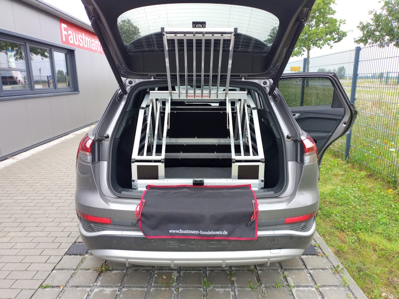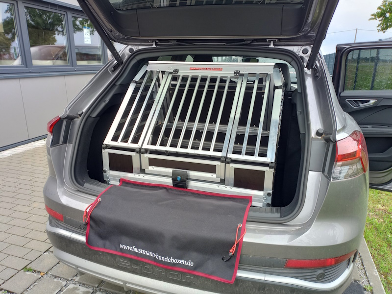 Auf diesem Bildern findet Ihr einen Audi Q4 e tron mit einer maßangefertigten Hundetransportbox von Faustmann-Hundeboxen. Bei dem Fahrzeug wurde der erhöhte Ladeboden entfernt um mehr Höhe für den Hund heraus zu holen. Hier kommt unsere "zweigeteilte Hundebox" ins Spiel. Man kann den unteren Teil der Box abschrauben und somit gewinnt man die komplette Höhe, die der Kofferraum her gibt.