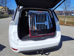Bei dieser A2-Doppel-Hundetransportbox haben wir die Trennwand so versetzt, das ein größerer und ein kleinerer Hund seinen sicheren Platz, beim Transport von A nach B hat. Durch die optimale Anpassung an den Kofferraum der Fahrzeuges, wurde der vorhandene Platz optimal ausgenutzt.