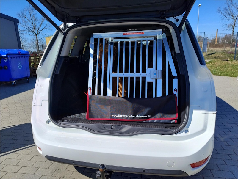 Diese zwei fahren nun auch sicher in einer Faustmann-Hundebox. Aus unserem Hundeboxen-Zubehör wurden Fallenschlösser verbaut.