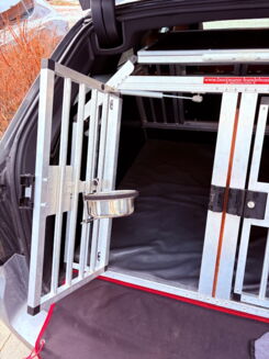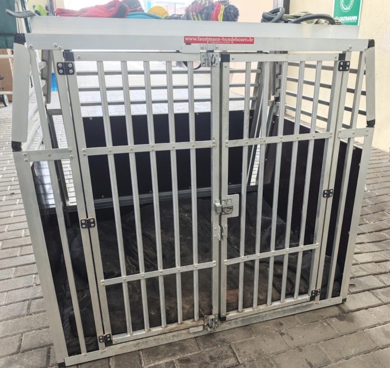 Zubehör: Fallenschlösser mit integriertem Sicherheitsschloss, Notausstieg, Gasdruckfedern an den Türen, Stoßstangenschutz 100er, Einlegematte Kunstleder Graphit, Wassernäpfe (Edelstahl) herausnehmbar, LED-Beleuchtung